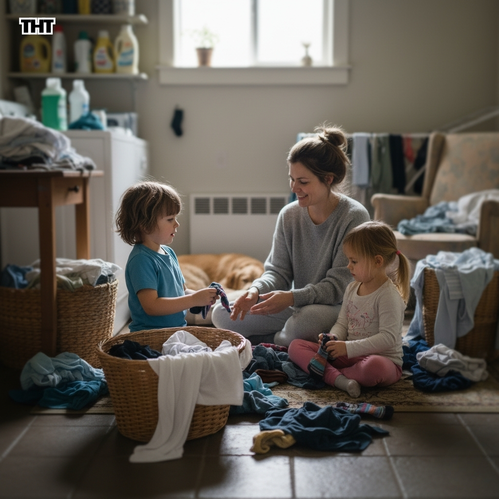 Somewhere between the second basket of socks and the moment I stepped on a tiny plastic dinosaur that absolutely did not belong in the laundry room, I realized I was doing that thing again. You know the thing. I was trying to turn a regular weekday into a “productive, efficient, responsible” day, while my kids were simply trying to exist near me with their own ideas of what helping should look like.
