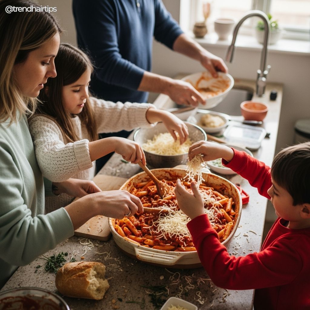 Baked ziti, roasted vegetables, bread. Food that doesn’t punish mistakes. Food that can be reheated without losing its soul. Food that says, “You don’t have to perform. You just have to eat.”